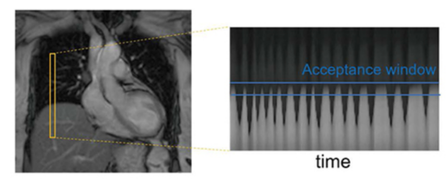 A “pencil‑beam” excitation creates a narrow, cylindrical region of magnetization. By positioning this small beam over the liver you get a continuous signal that changes as the patient breathes: the liver moves with respiration, and that motion modifies the measured signal. This motion signal is used as a respiratory trace to accept data only during a chosen breathing phase (for example, end‑expiration) and to reject data acquired at other times, reducing motion artifacts in cardiac MRI.