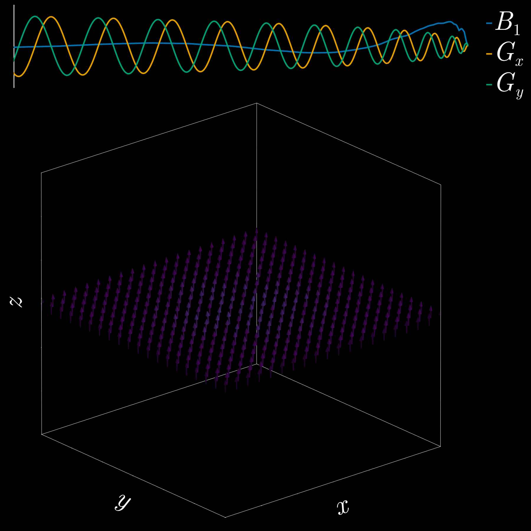 Here the forward model \(\mathrm{\mathbf{A}}(\mathbf{x})\) is implemented by a physics simulation: we numerically solve the Bloch equations for a given RF waveform and gradient trajectory to predict the resulting transverse magnetization. Rather than reimplementing those equations, we use the Julia package KomaMRI.jl to run the simulation and obtain \(\mathrm{\mathbf{A}}(\mathbf{x})\).