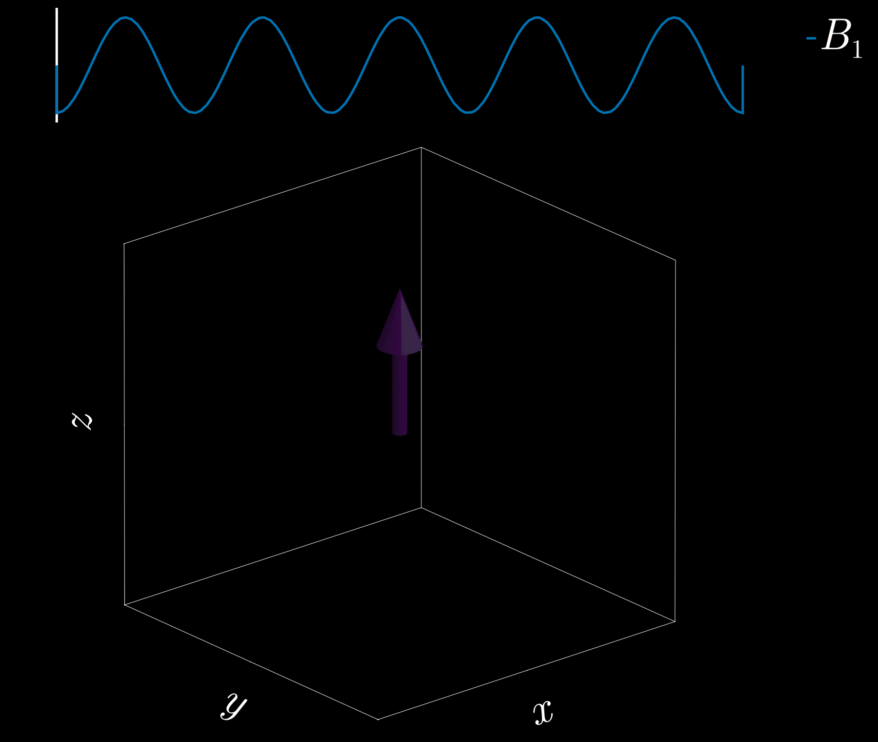 If we apply a radio-frequency (RF) pulse at that frequency — the RF field commonly denoted \(B_1\) in MRI — it will tip the spins away from alignment with the main magnetic field, \(B_0\) (the z-direction). This is analogous to pushing a child on a swing: if the pushes are applied at the correct intervals, the swing’s amplitude increases. Oh! So that is resonance!